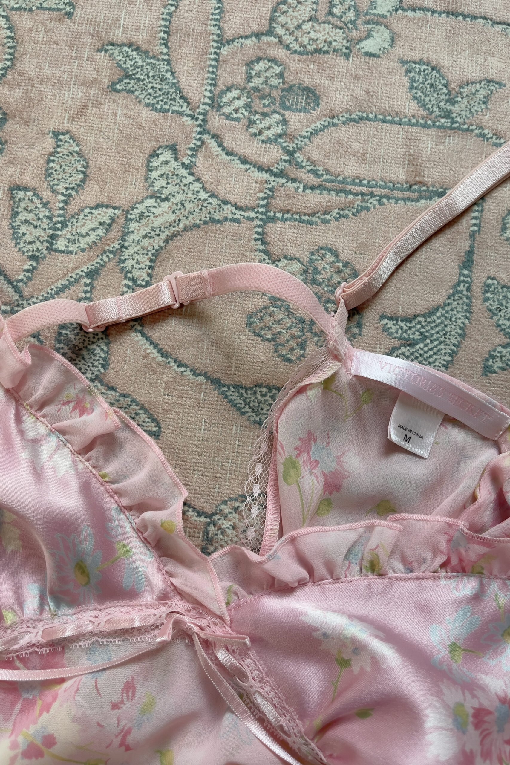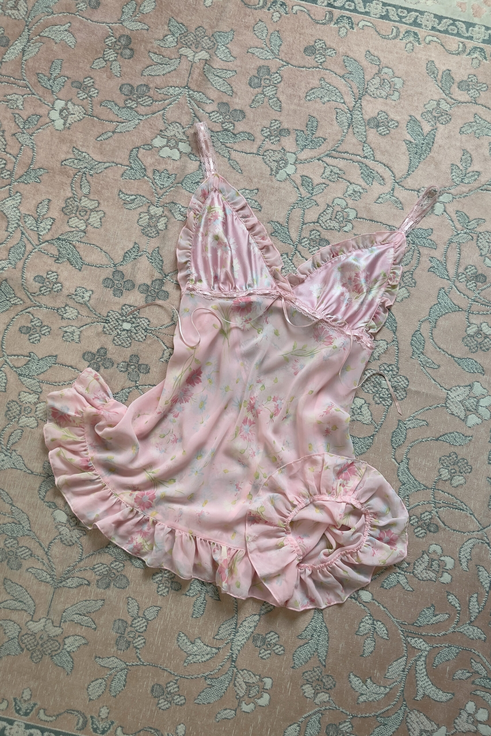 Romantic vintage slip dress from Victoria’s Secret, dating back to 2003. Designed in a dreamy soft blush pink tone, the satin bust is patterned with pastel floral prints in pink, pale blue, and soft white, with light green leaves, and finished with soft chiffon ruffles. A lace band with woven satin ribbon runs beneath the bust, tied with a delicate bow at the center front.