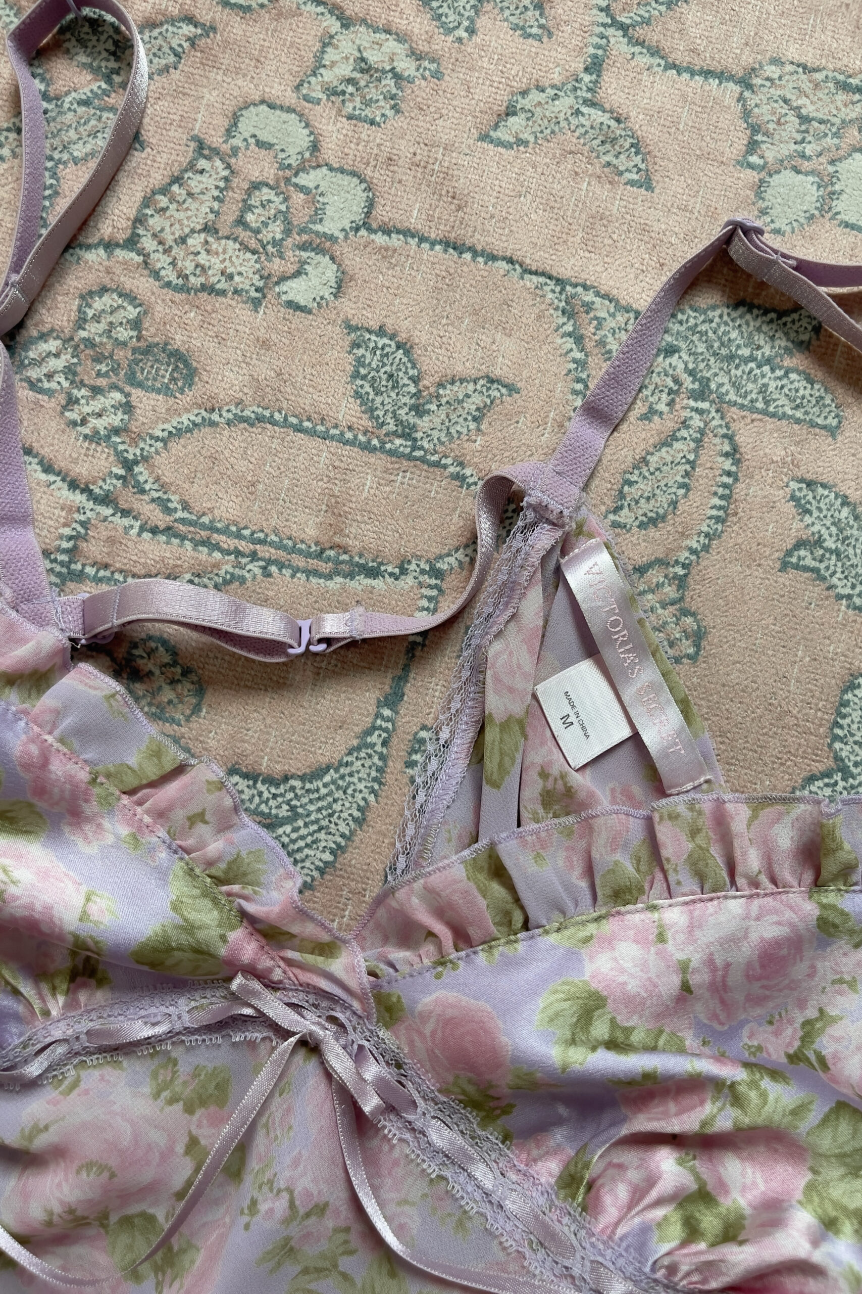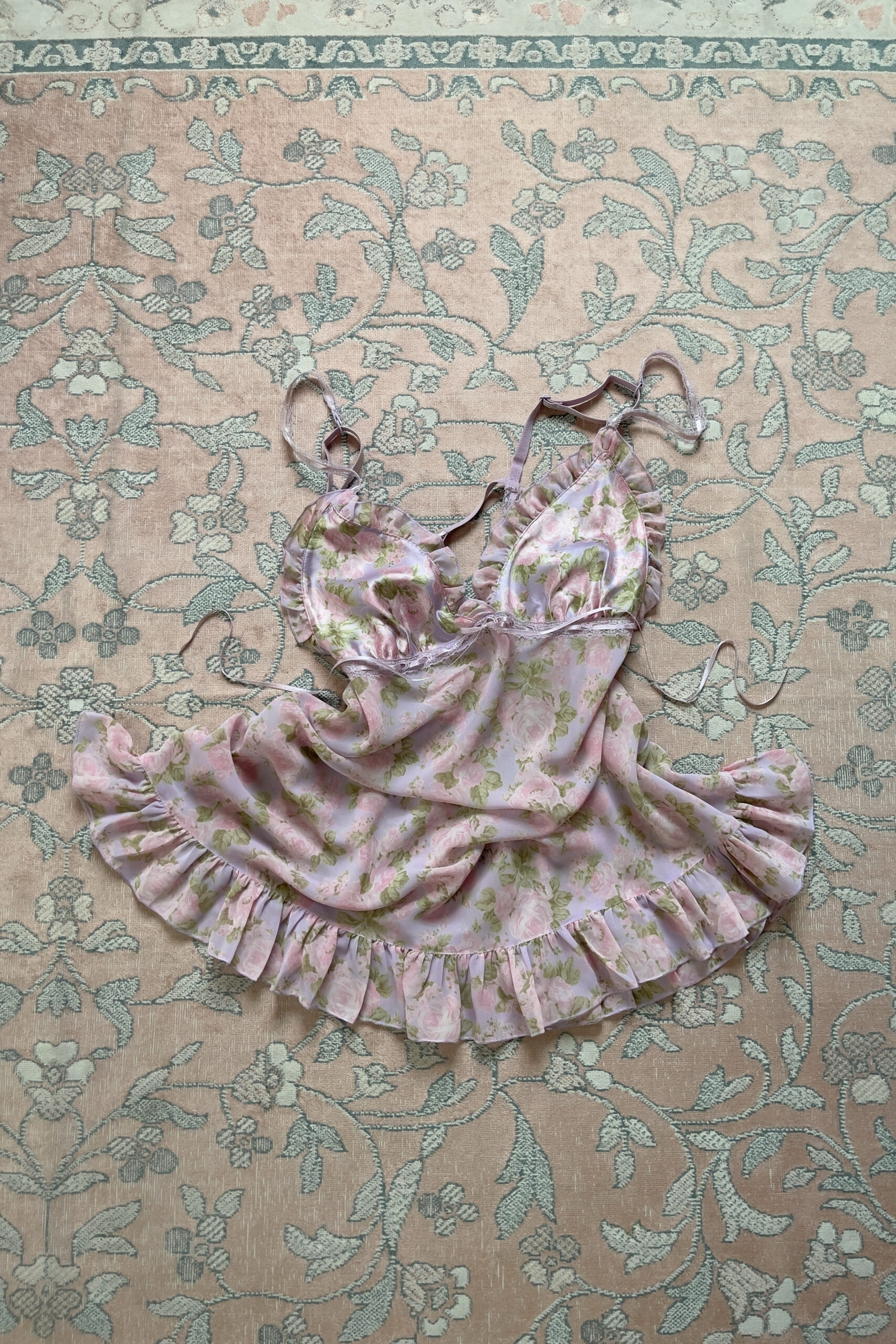 Romantic vintage slip dress from Victoria’s Secret, dating back to 2003. Designed in a dreamy soft pastel lavender tone, the satin bust is patterned with blush-pink floral prints and soft green leaves and finished with soft chiffon ruffles. A lace band with woven satin ribbon runs beneath the bust, tied with a delicate bow at the center front.